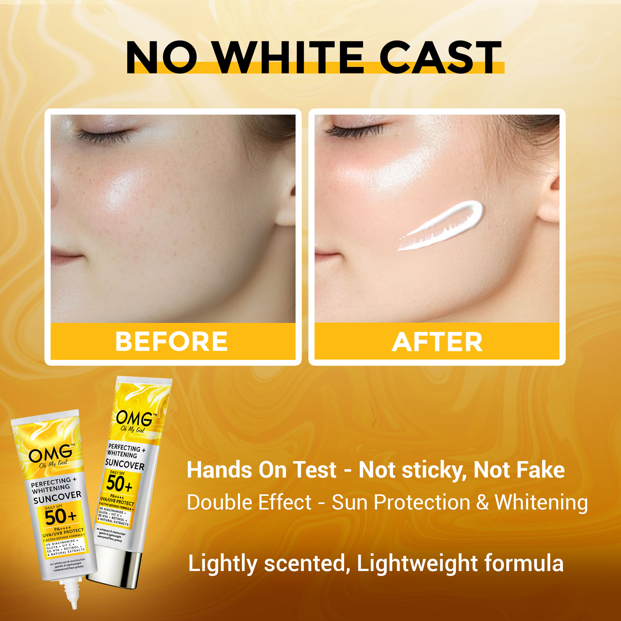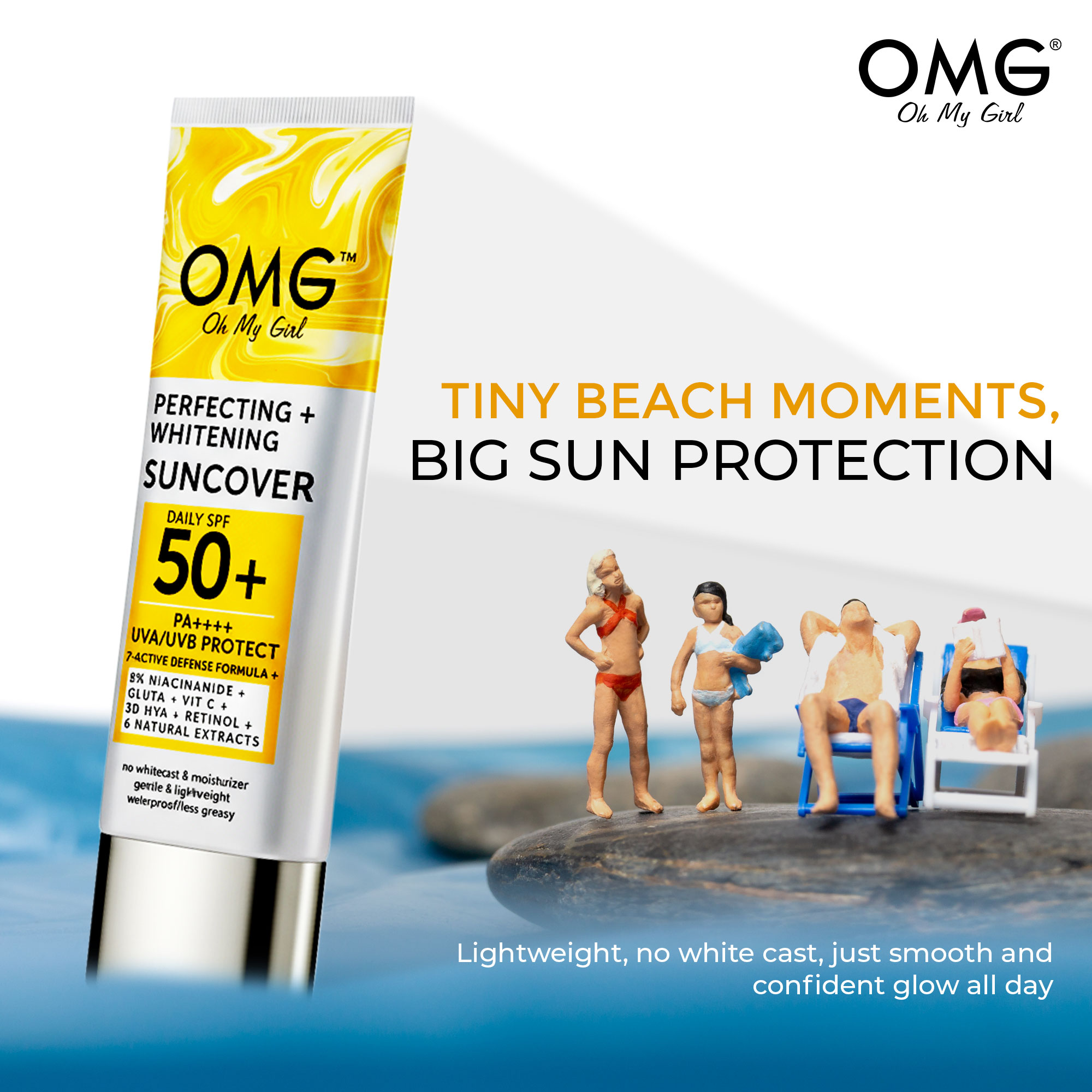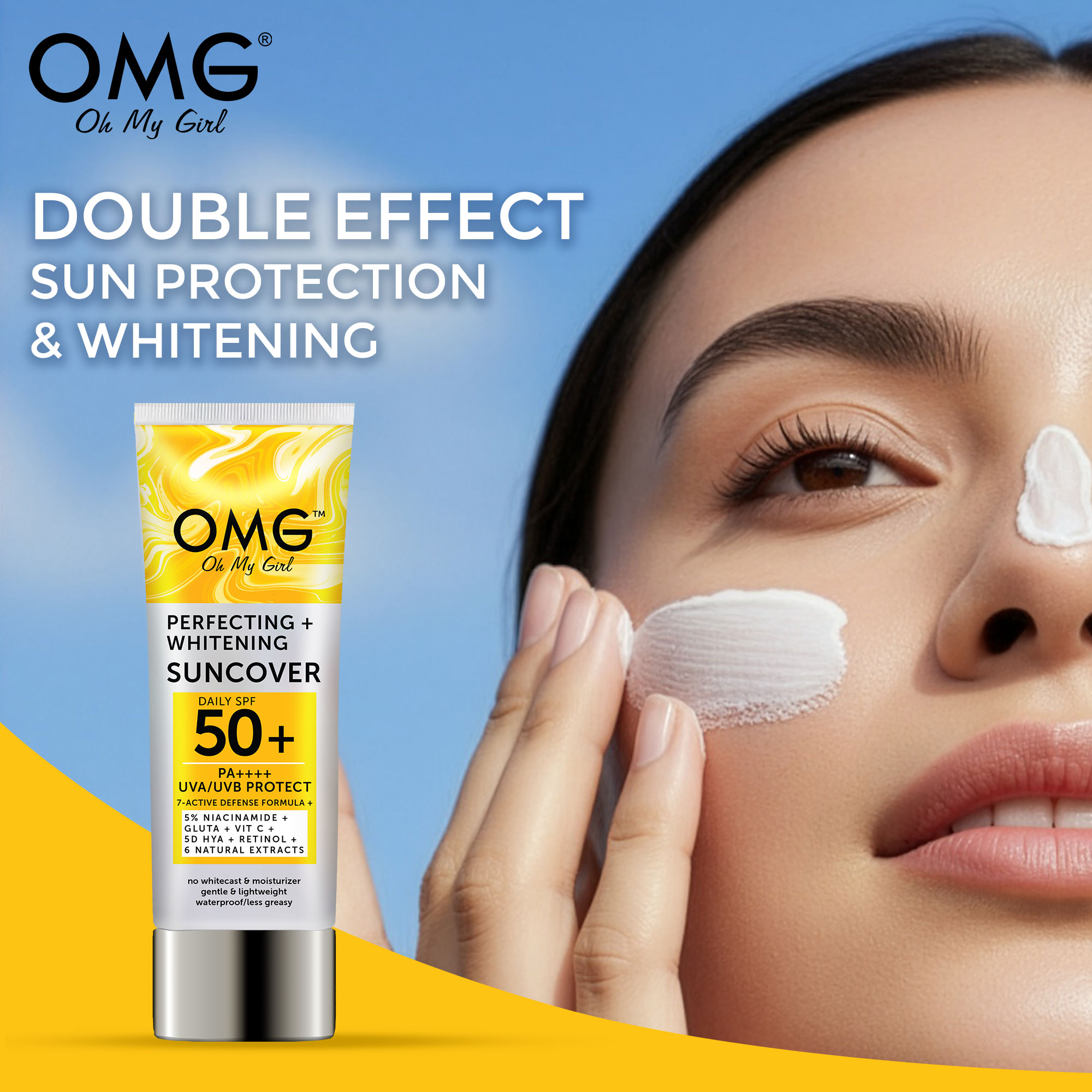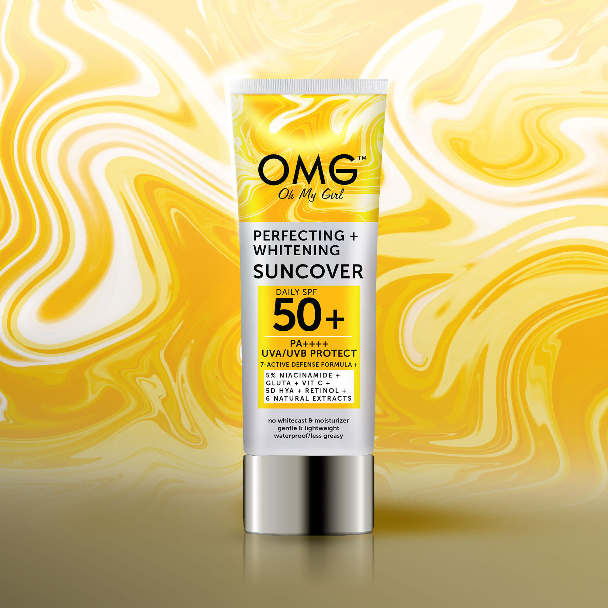 OMG Suncover Perfecting + Whitening is a lightweight daily sun protection for face and body. It helps shield skin from UVA/UVB rays while keeping it moisturized and looking naturally bright. The smooth, non-greasy formula absorbs easily with no white cast, making it comfortable for everyday use.