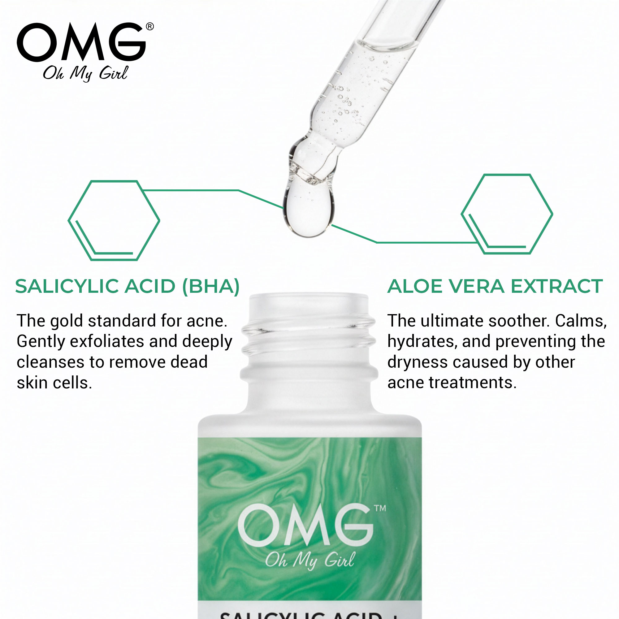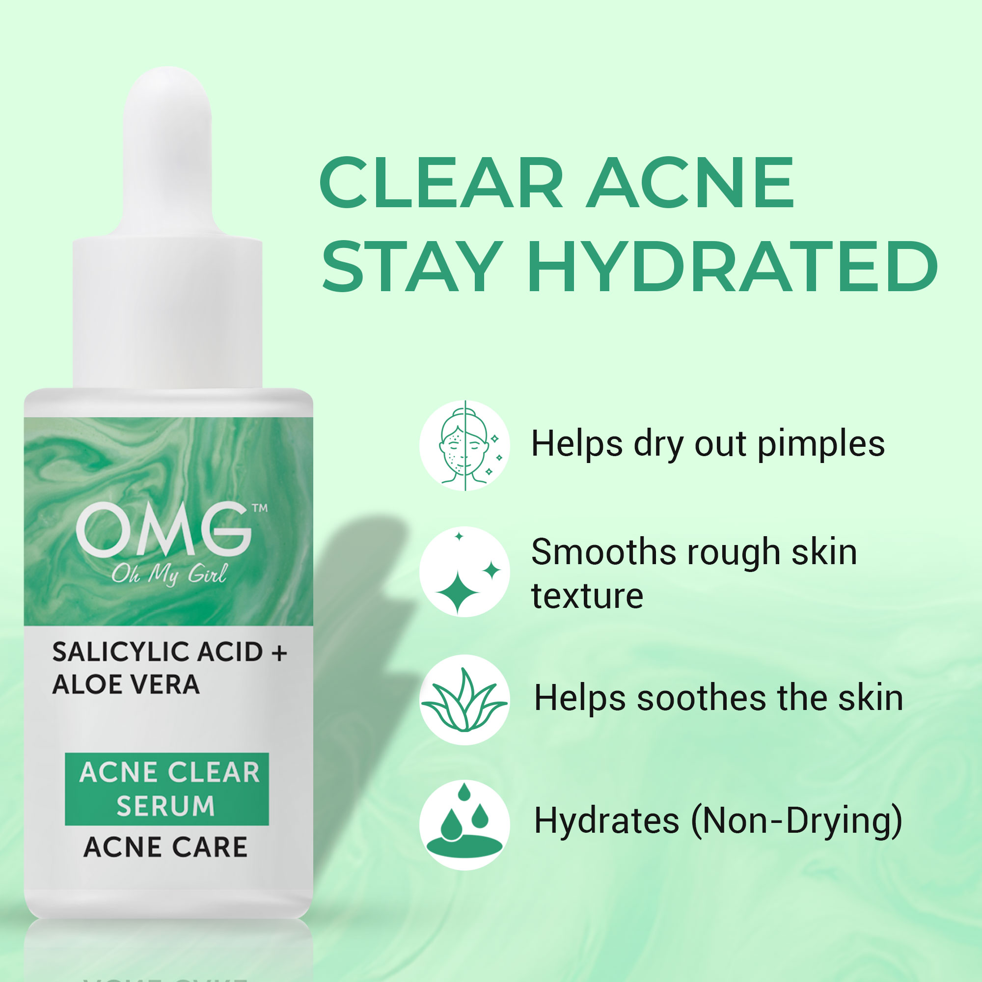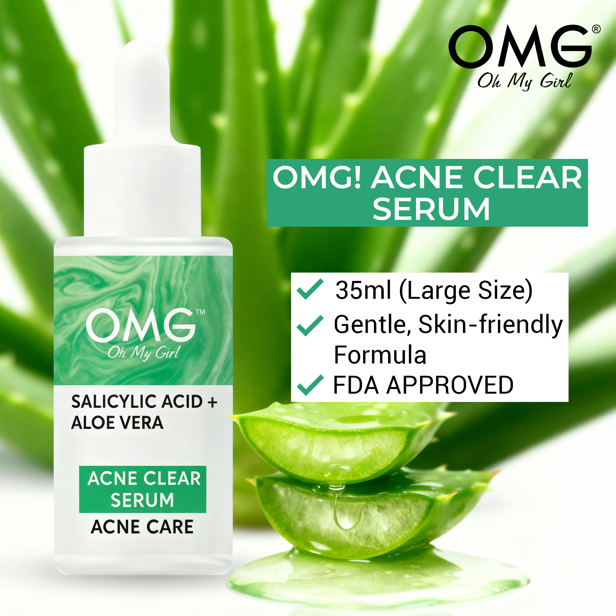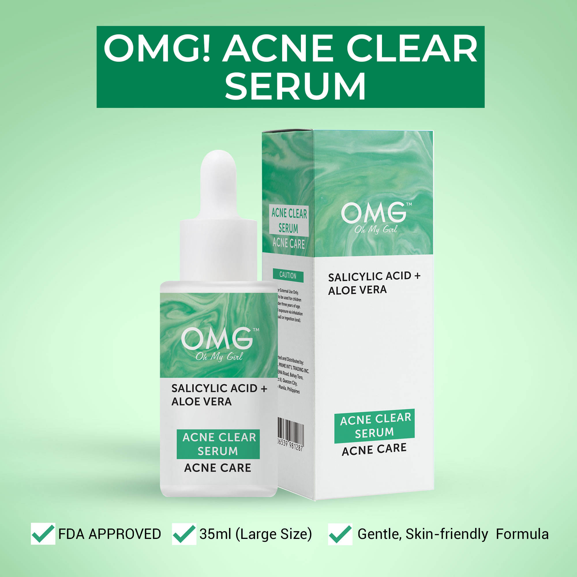 OMG Acne Clear Serum helps reduce breakouts while keeping skin hydrated and smooth. With Salicylic Acid and Aloe Vera, this lightweight, fast-absorbing serum unclogs pores, soothes irritation, and improves skin texture without dryness. Suitable for acne-prone, oily, and sensitive skin.