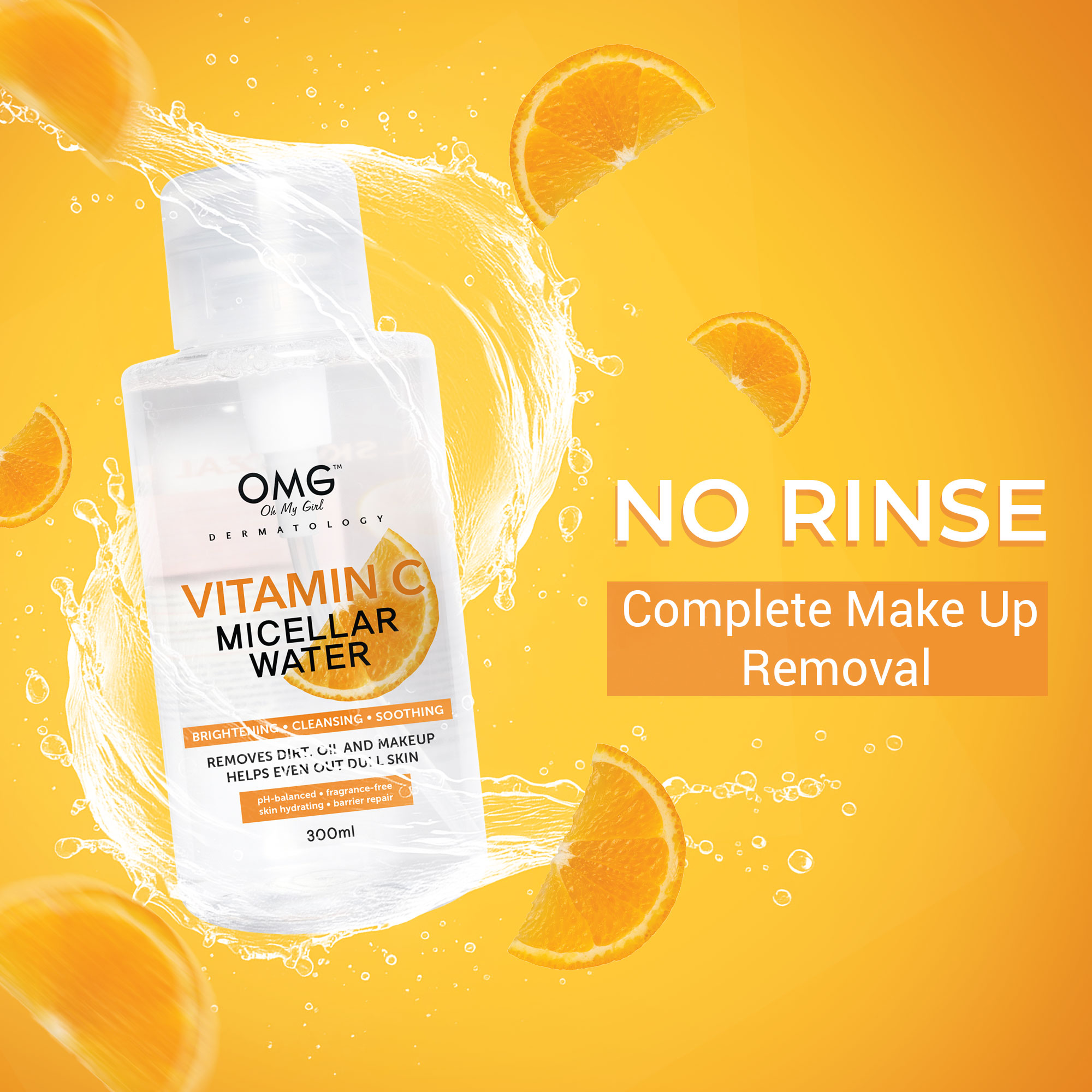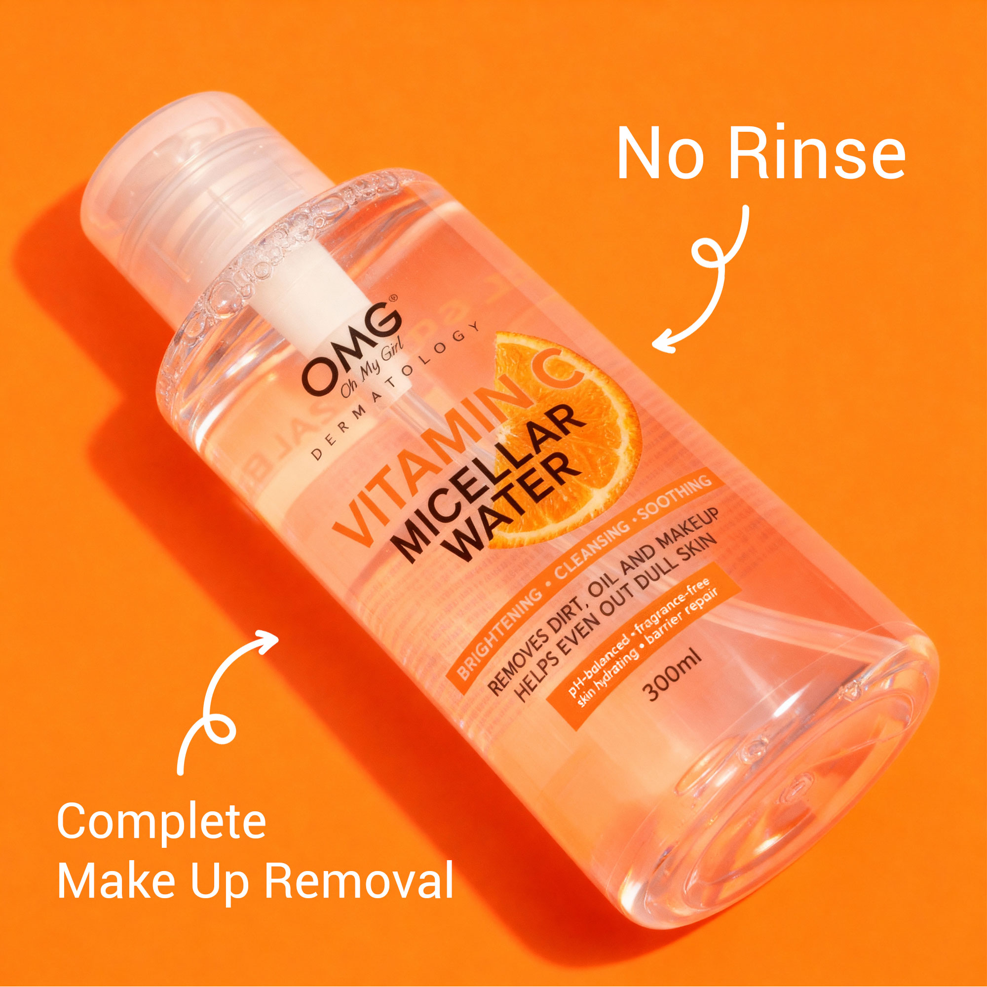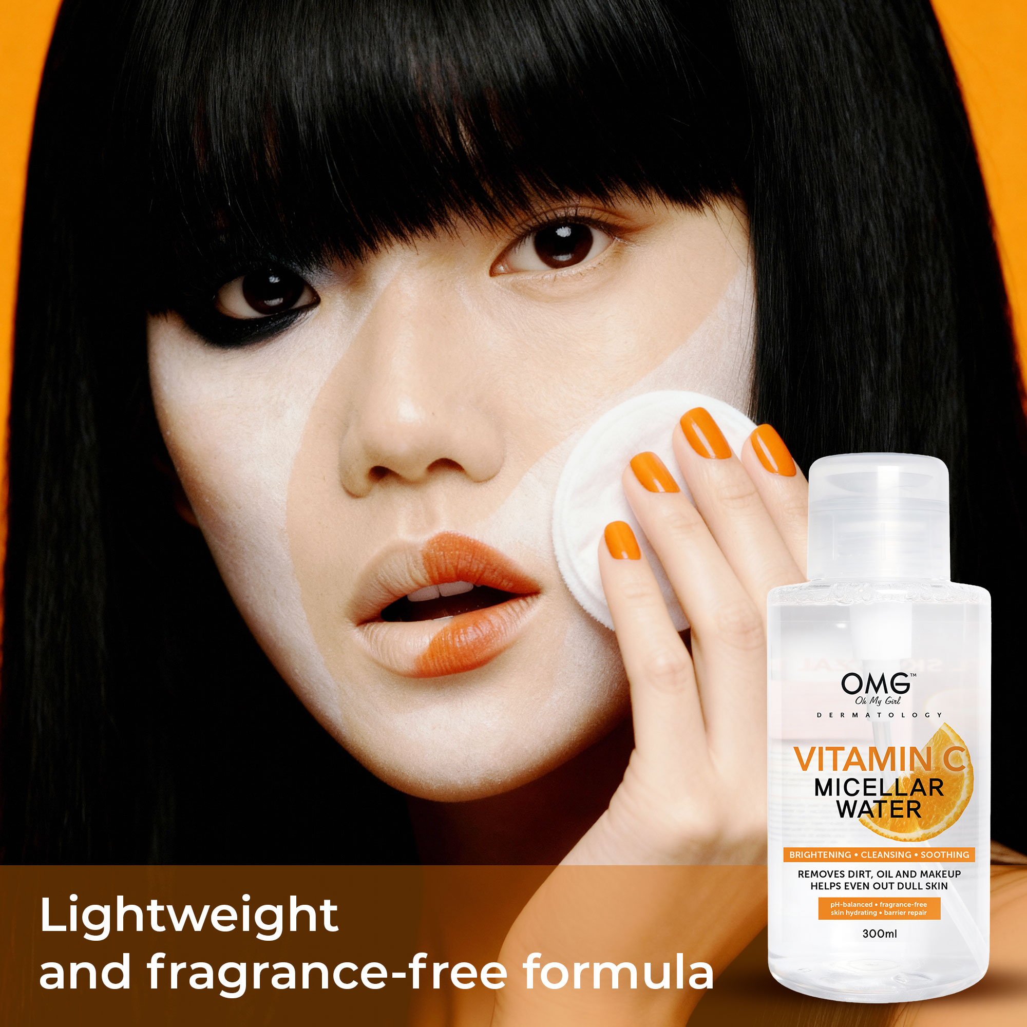 OMG Vitamin C Micellar Water gently removes dirt, oil, and makeup while helping brighten dull skin. Formulated with Stabilized Vitamin C, Cica, Panthenol, and Amino Acids, it soothes, hydrates, and supports the skin barrier. Lightweight, pH-balanced, fragrance-free, and no rinsing required. Suitable for daily use.