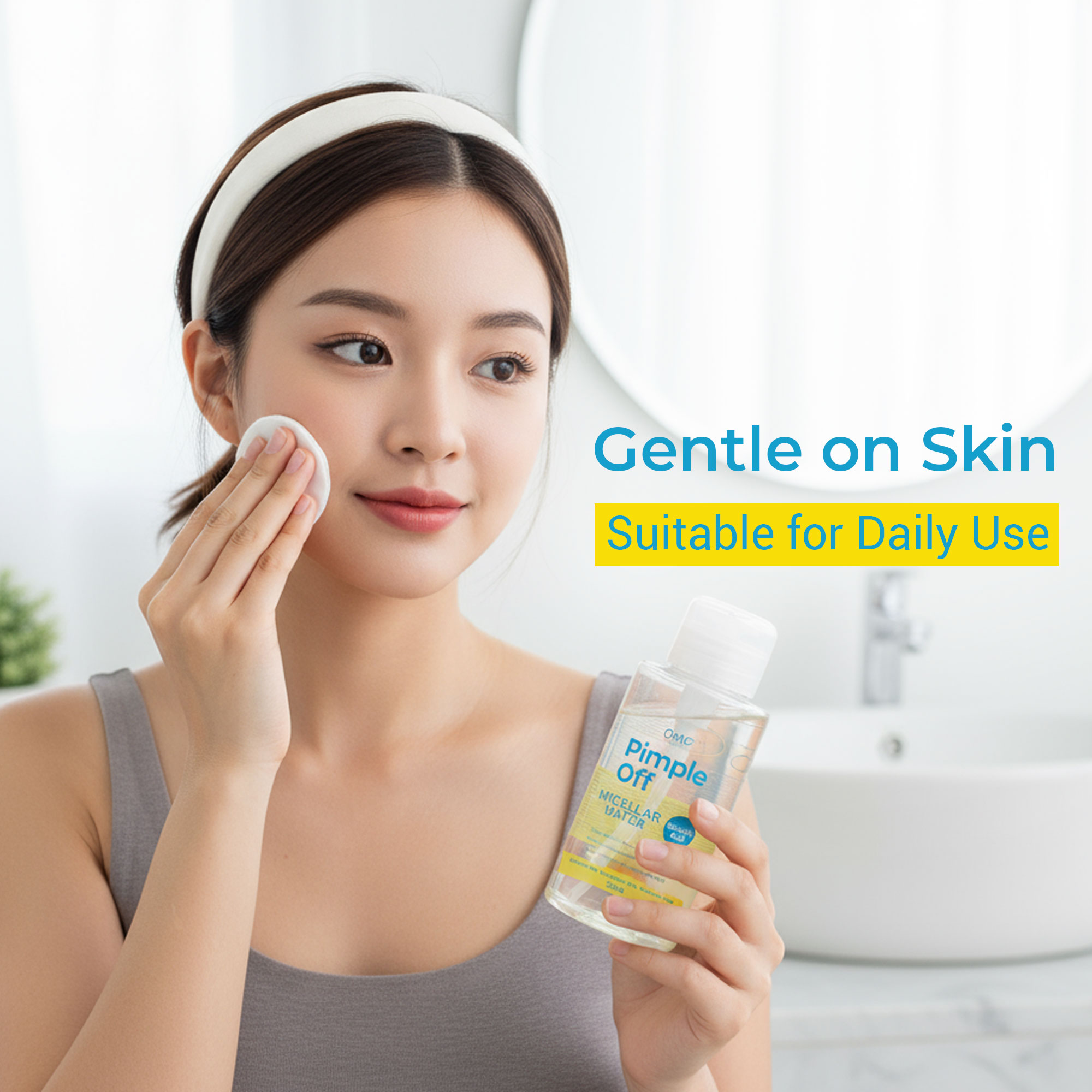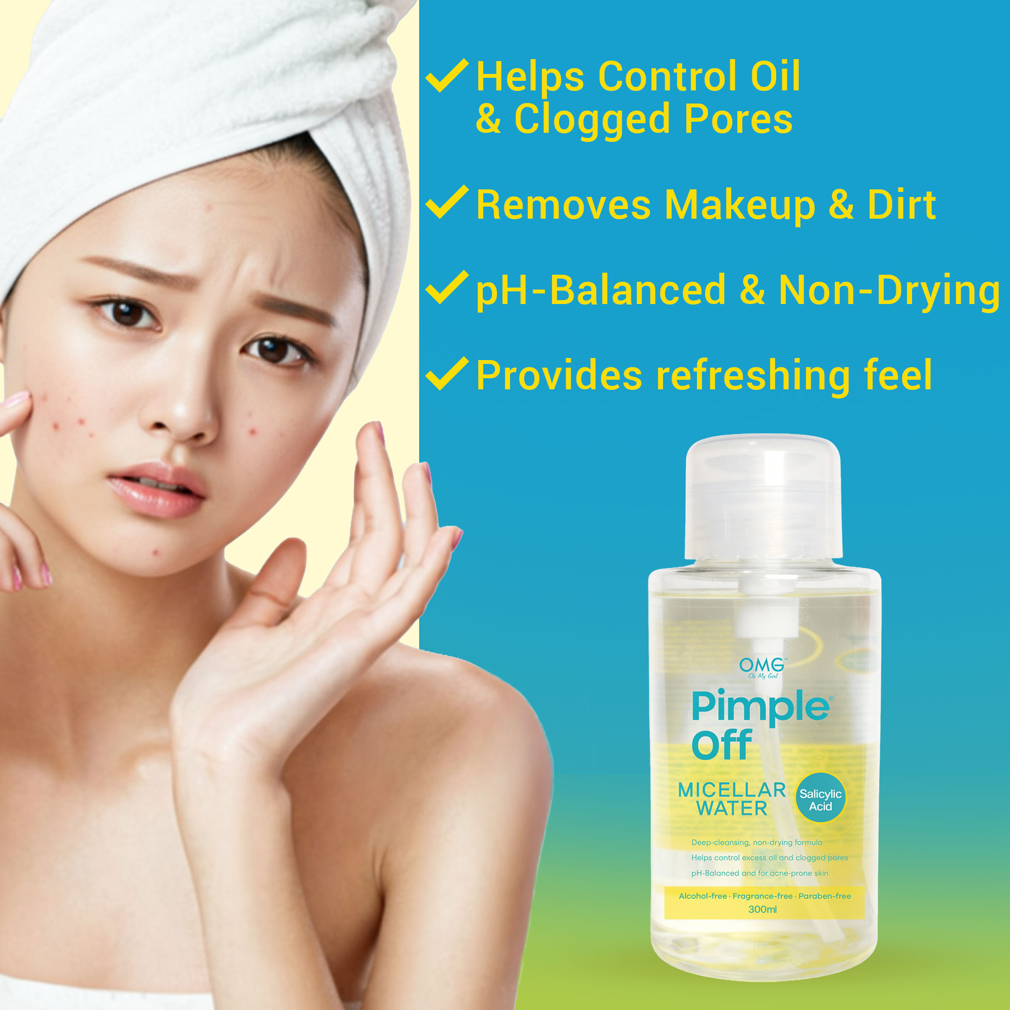 OMG Pimple Off Micellar Water helps fight pimples while gently cleansing skin. With Salicylic Acid and Cica, it removes makeup, excess oil, and impurities without drying. The soothing, pH-balanced formula helps keep skin clear, calm, and comfortable for daily use. Suitable for acne-prone skin.